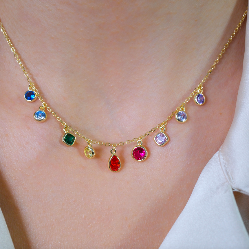 Nine beautiful and vibrant multicolored gemstones dangling on a delicate chain. Crafted with a gold filled setting and lobster clasp. Bring some shine to your next stack with this go-to piece.